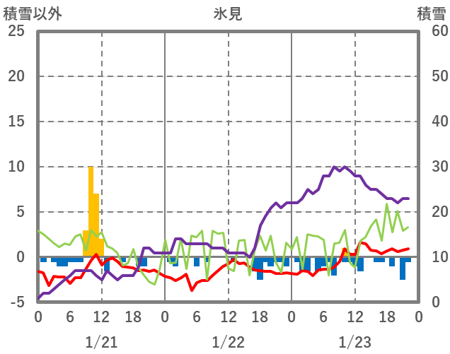 | 日 | 時 | 気温 | 降水 | 風向/風速 | 日照 | 積雪 | 降雪 |