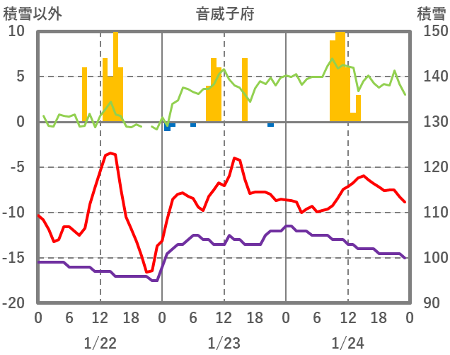 | 日 | 時 | 気温 | 降水 | 風向/風速 | 日照 | 積雪 | 降雪 |