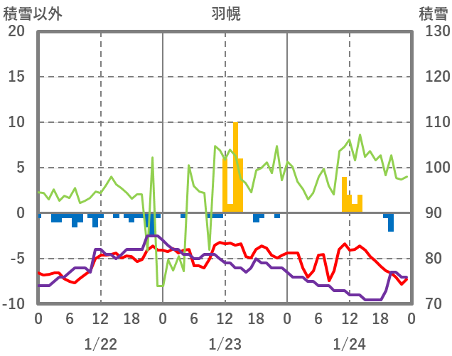 | 日 | 時 | 気温 | 降水 | 風向/風速 | 日照 | 積雪 | 降雪 |