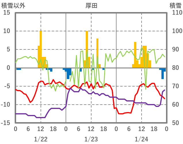 | 日 | 時 | 気温 | 降水 | 風向/風速 | 日照 | 積雪 | 降雪 |