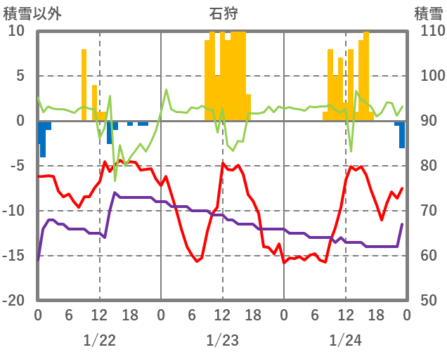 | 日 | 時 | 気温 | 降水 | 風向/風速 | 日照 | 積雪 | 降雪 |