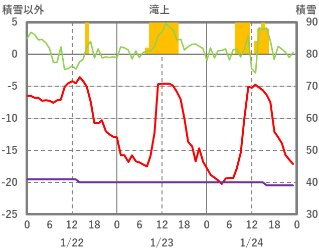 | 日 | 時 | 気温 | 降水 | 風向/風速 | 日照 | 積雪 | 降雪 |