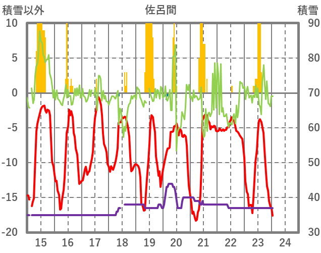 | 日 | 時 | 気温 | 降水 | 風向/風速 | 日照 | 積雪 | 降雪 |