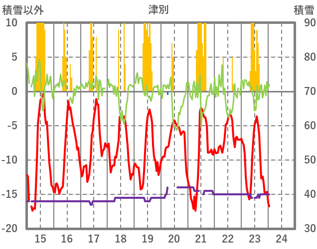 | 日 | 時 | 気温 | 降水 | 風向/風速 | 日照 | 積雪 | 降雪 |