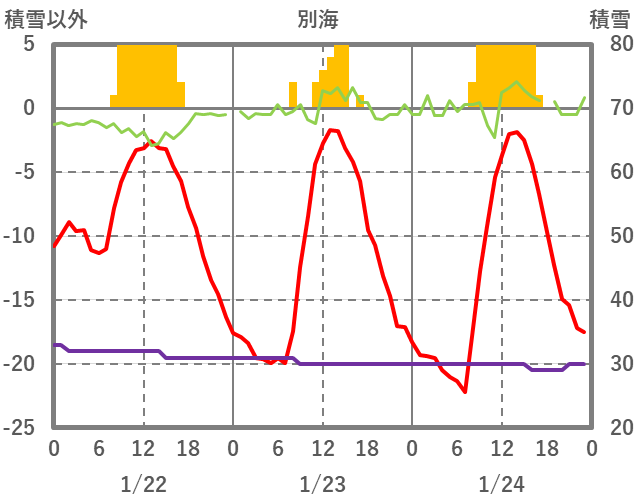 | 日 | 時 | 気温 | 降水 | 風向/風速 | 日照 | 積雪 | 降雪 |