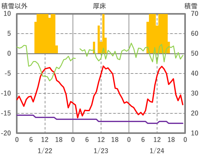 | 日 | 時 | 気温 | 降水 | 風向/風速 | 日照 | 積雪 | 降雪 |