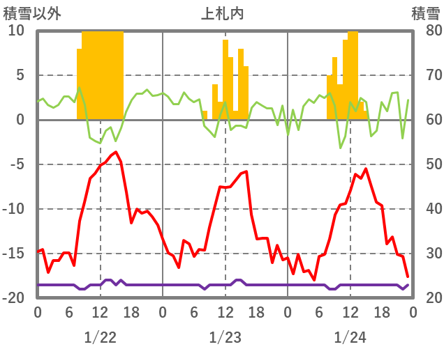 | 日 | 時 | 気温 | 降水 | 風向/風速 | 日照 | 積雪 | 降雪 |
