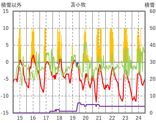 | 日 | 時 | 気温 | 降水 | 風向/風速 | 日照 | 積雪 | 降雪 |