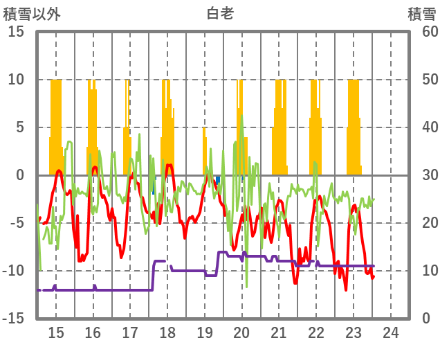 | 日 | 時 | 気温 | 降水 | 風向/風速 | 日照 | 積雪 | 降雪 |