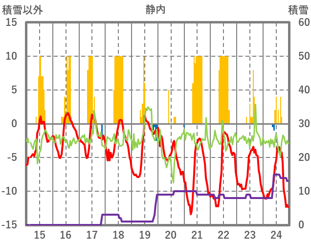 | 日 | 時 | 気温 | 降水 | 風向/風速 | 日照 | 積雪 | 降雪 |