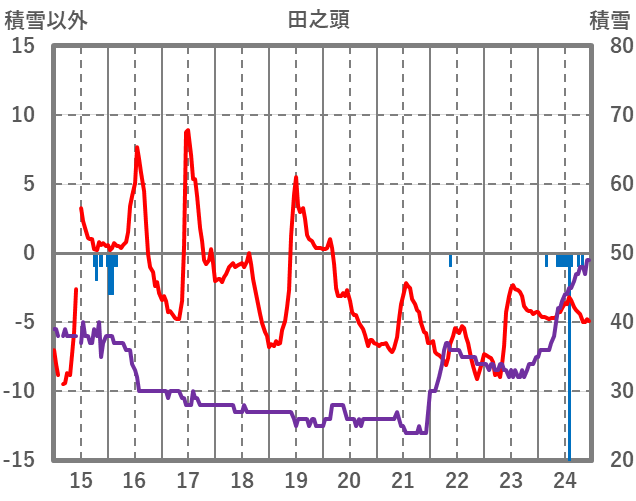 | 日 | 時 | 気温 | 降水 | 風向/風速 | 日照 | 積雪 | 降雪 |