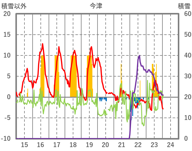 | 日 | 時 | 気温 | 降水 | 風向/風速 | 日照 | 積雪 | 降雪 |