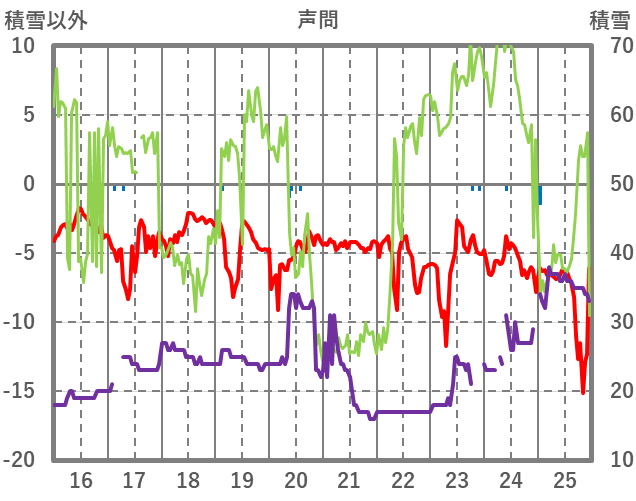 | 日 | 時 | 気温 | 降水 | 風向/風速 | 日照 | 積雪 | 降雪 |