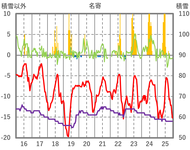 | 日 | 時 | 気温 | 降水 | 風向/風速 | 日照 | 積雪 | 降雪 |
