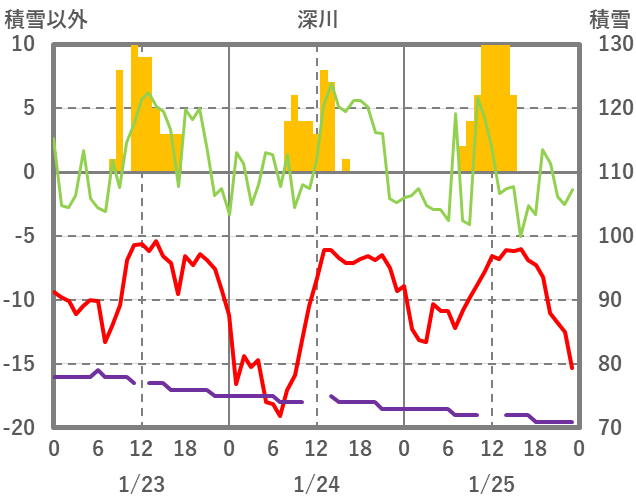 | 日 | 時 | 気温 | 降水 | 風向/風速 | 日照 | 積雪 | 降雪 |