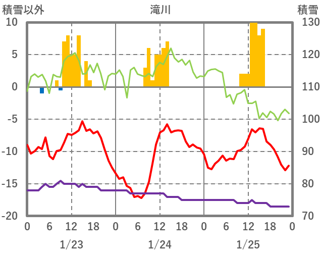 | 日 | 時 | 気温 | 降水 | 風向/風速 | 日照 | 積雪 | 降雪 |