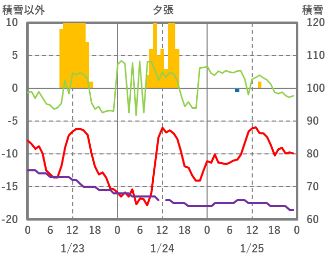 | 日 | 時 | 気温 | 降水 | 風向/風速 | 日照 | 積雪 | 降雪 |