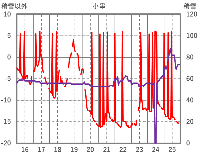 | 日 | 時 | 気温 | 降水 | 風向/風速 | 日照 | 積雪 | 降雪 |