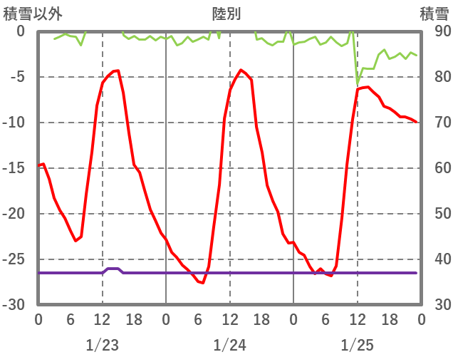 | 日 | 時 | 気温 | 降水 | 風向/風速 | 日照 | 積雪 | 降雪 |