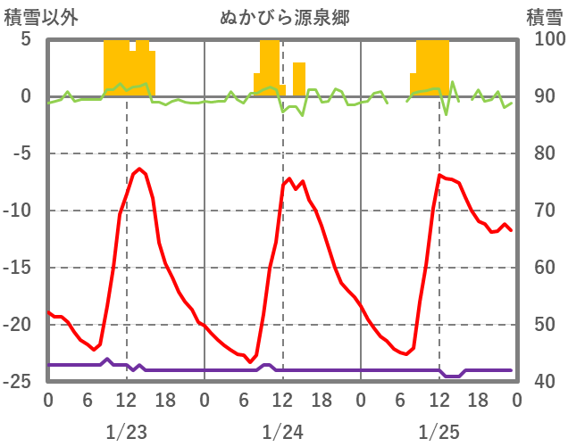 | 日 | 時 | 気温 | 降水 | 風向/風速 | 日照 | 積雪 | 降雪 |