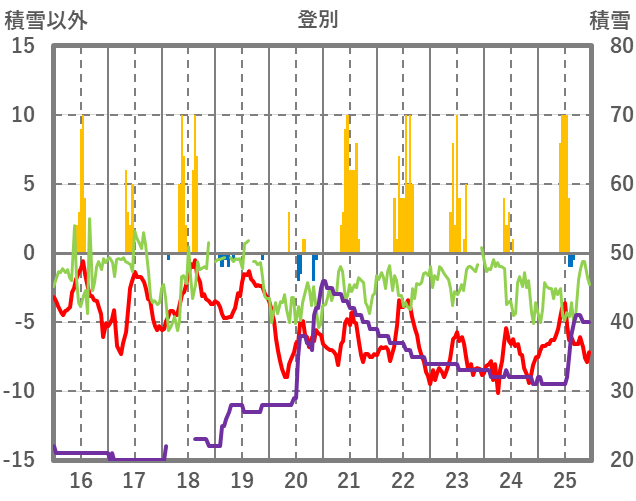 | 日 | 時 | 気温 | 降水 | 風向/風速 | 日照 | 積雪 | 降雪 |