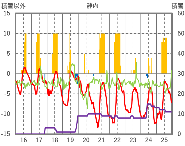 | 日 | 時 | 気温 | 降水 | 風向/風速 | 日照 | 積雪 | 降雪 |