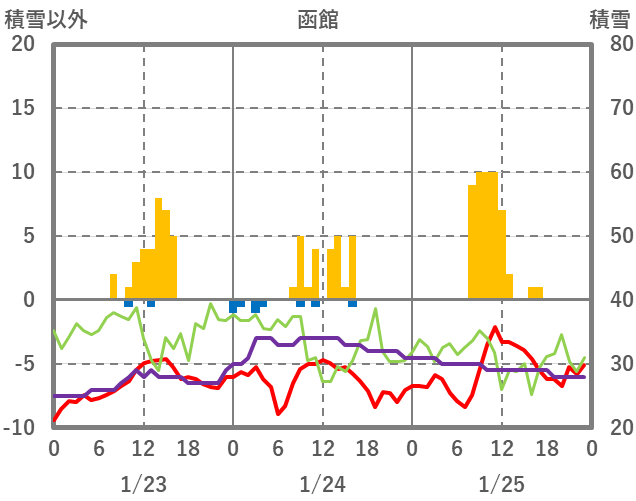 | 日 | 時 | 気温 | 降水 | 風向/風速 | 日照 | 積雪 | 降雪 |