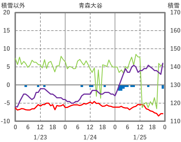 | 日 | 時 | 気温 | 降水 | 風向/風速 | 日照 | 積雪 | 降雪 |