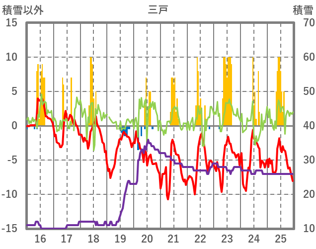 | 日 | 時 | 気温 | 降水 | 風向/風速 | 日照 | 積雪 | 降雪 |