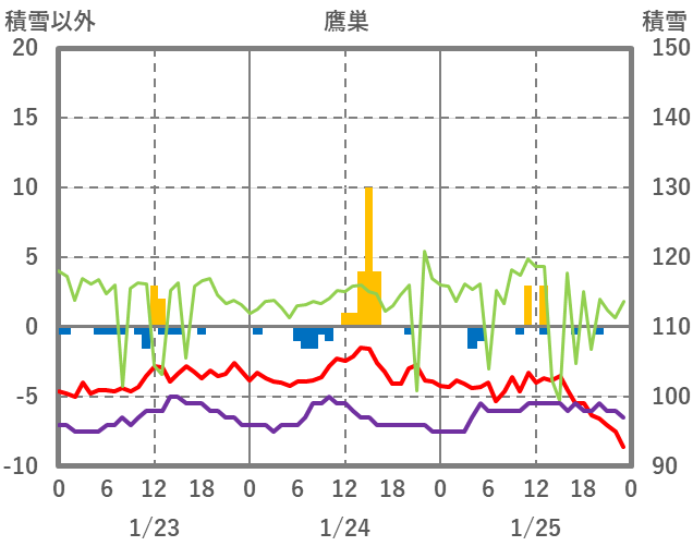 | 日 | 時 | 気温 | 降水 | 風向/風速 | 日照 | 積雪 | 降雪 |