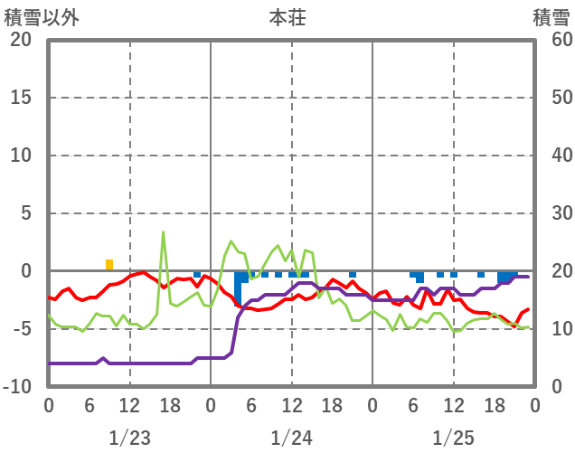 | 日 | 時 | 気温 | 降水 | 風向/風速 | 日照 | 積雪 | 降雪 |