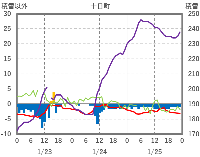 | 日 | 時 | 気温 | 降水 | 風向/風速 | 日照 | 積雪 | 降雪 |