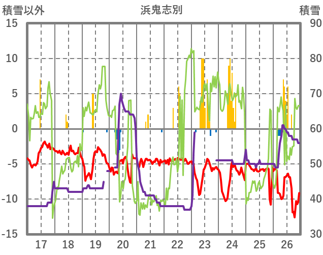 | 日 | 時 | 気温 | 降水 | 風向/風速 | 日照 | 積雪 | 降雪 |