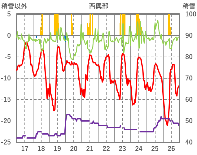 | 日 | 時 | 気温 | 降水 | 風向/風速 | 日照 | 積雪 | 降雪 |