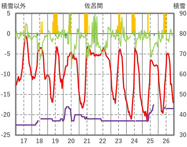| 日 | 時 | 気温 | 降水 | 風向/風速 | 日照 | 積雪 | 降雪 |