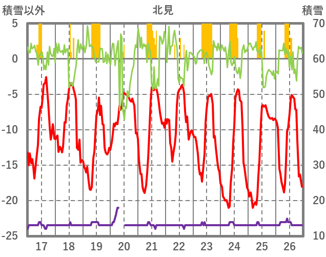| 日 | 時 | 気温 | 降水 | 風向/風速 | 日照 | 積雪 | 降雪 |