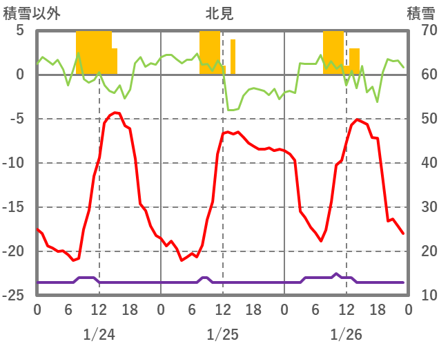 | 日 | 時 | 気温 | 降水 | 風向/風速 | 日照 | 積雪 | 降雪 |