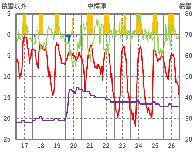 | 日 | 時 | 気温 | 降水 | 風向/風速 | 日照 | 積雪 | 降雪 |