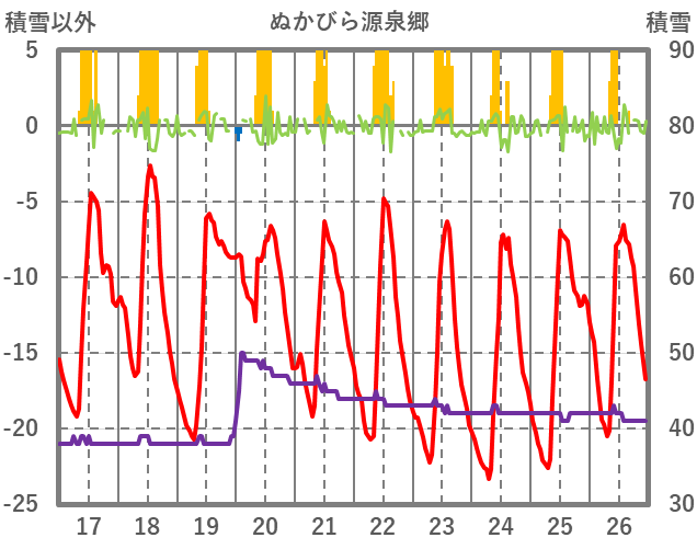 | 日 | 時 | 気温 | 降水 | 風向/風速 | 日照 | 積雪 | 降雪 |