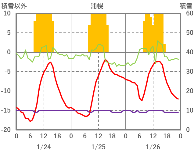 | 日 | 時 | 気温 | 降水 | 風向/風速 | 日照 | 積雪 | 降雪 |