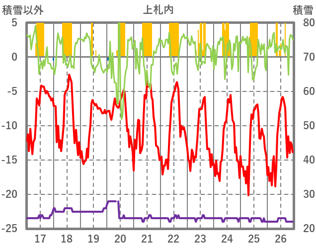 | 日 | 時 | 気温 | 降水 | 風向/風速 | 日照 | 積雪 | 降雪 |