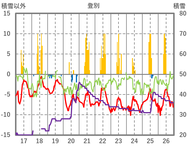| 日 | 時 | 気温 | 降水 | 風向/風速 | 日照 | 積雪 | 降雪 |