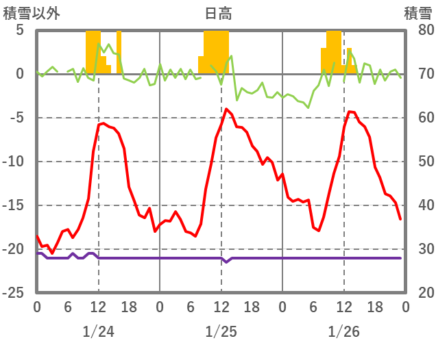 | 日 | 時 | 気温 | 降水 | 風向/風速 | 日照 | 積雪 | 降雪 |