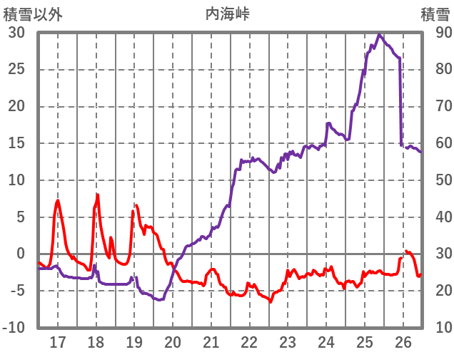 | 日 | 時 | 気温 | 降水 | 風向/風速 | 日照 | 積雪 | 降雪 |
