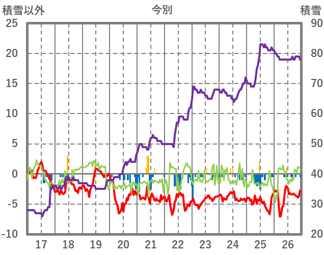 | 日 | 時 | 気温 | 降水 | 風向/風速 | 日照 | 積雪 | 降雪 |