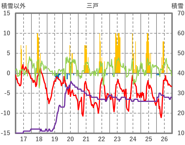 | 日 | 時 | 気温 | 降水 | 風向/風速 | 日照 | 積雪 | 降雪 |