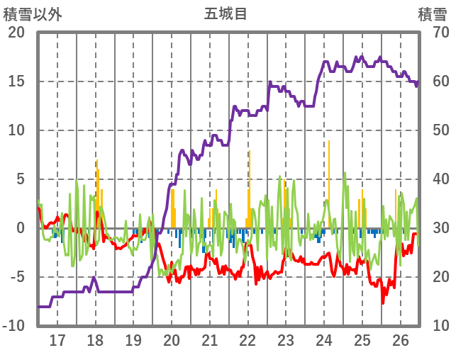 | 日 | 時 | 気温 | 降水 | 風向/風速 | 日照 | 積雪 | 降雪 |