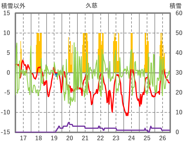 | 日 | 時 | 気温 | 降水 | 風向/風速 | 日照 | 積雪 | 降雪 |