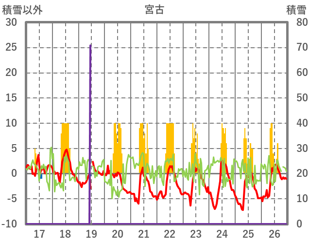 | 日 | 時 | 気温 | 降水 | 風向/風速 | 日照 | 積雪 | 降雪 |