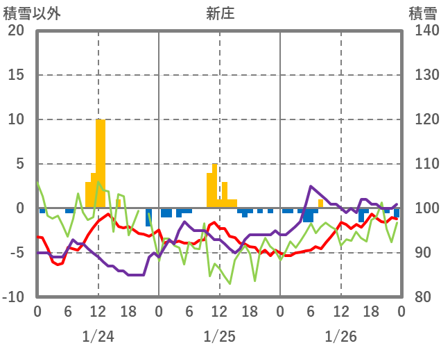 | 日 | 時 | 気温 | 降水 | 風向/風速 | 日照 | 積雪 | 降雪 |